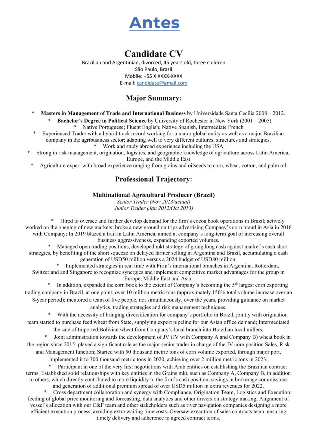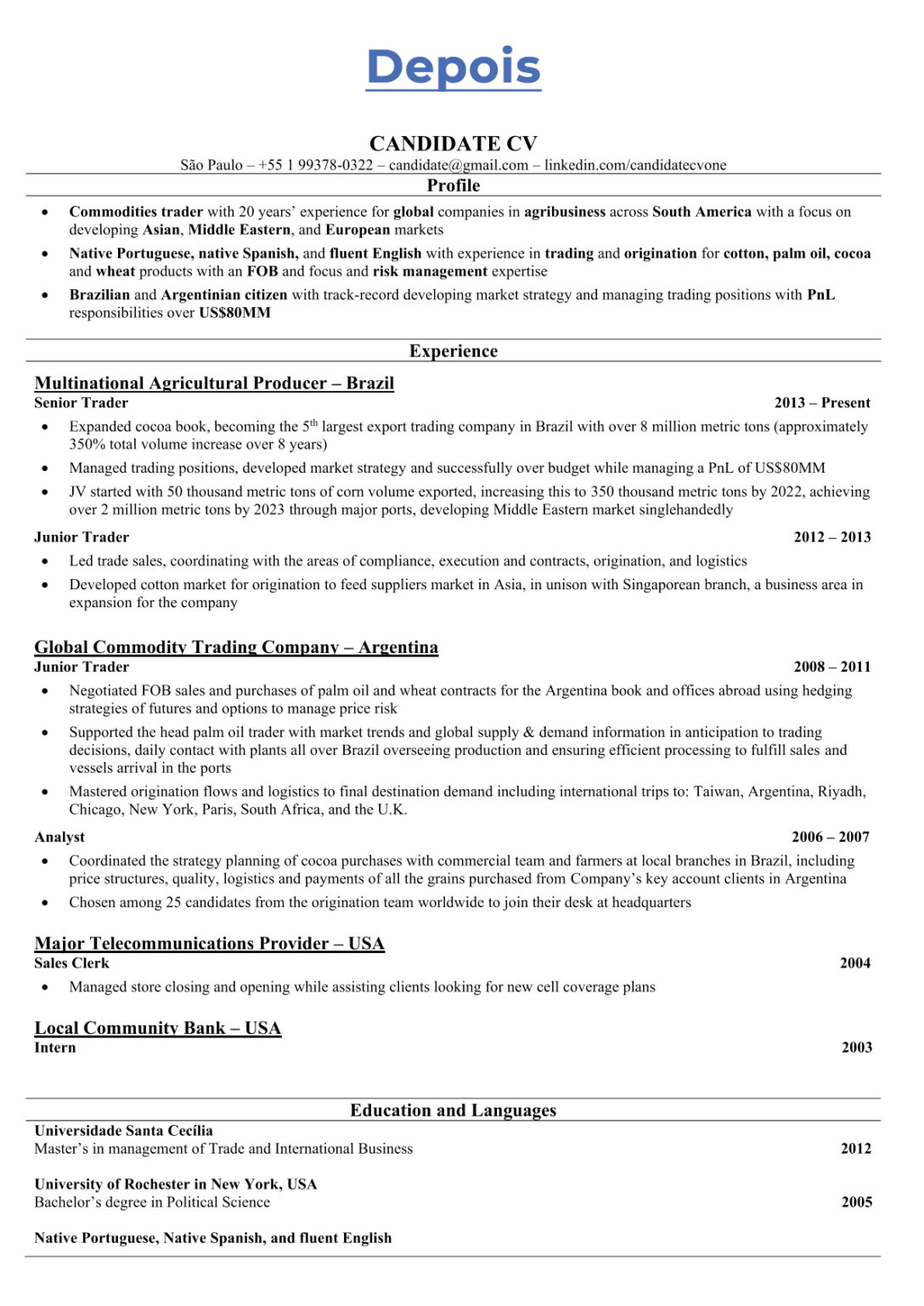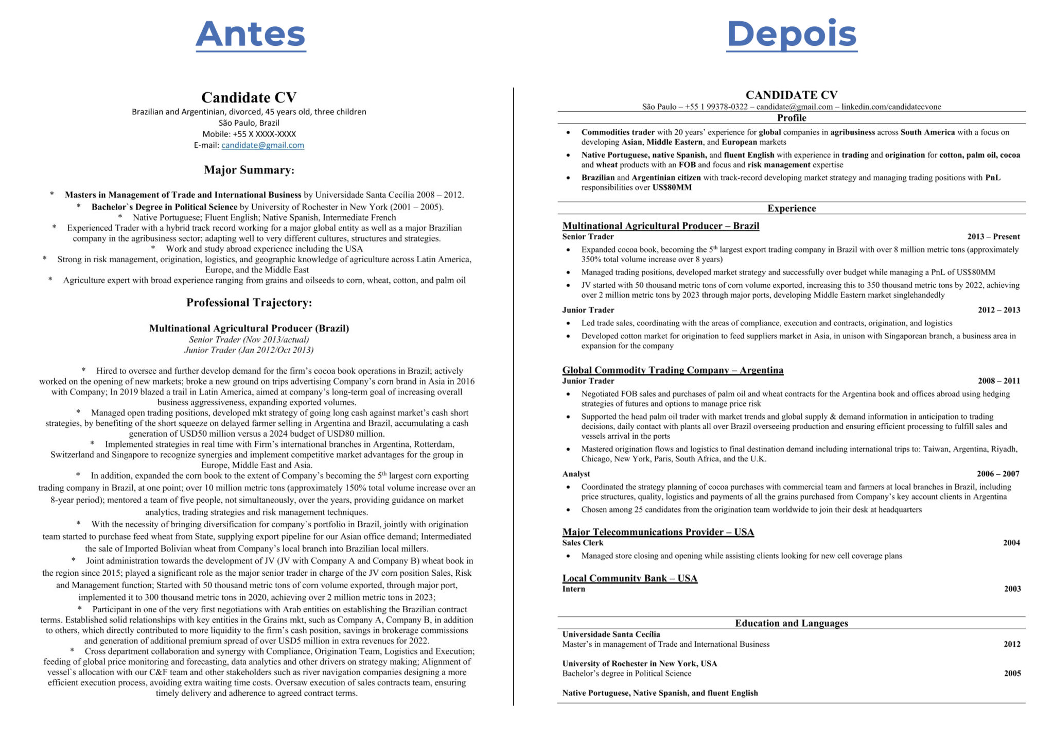 Deixa eu dar um feedback: eu mandei essa versão do CV One para 4 oportunidades de HR Head. As 4 me ligaram na mesma semana! Impressionante a efetividade do CV, arrasou!